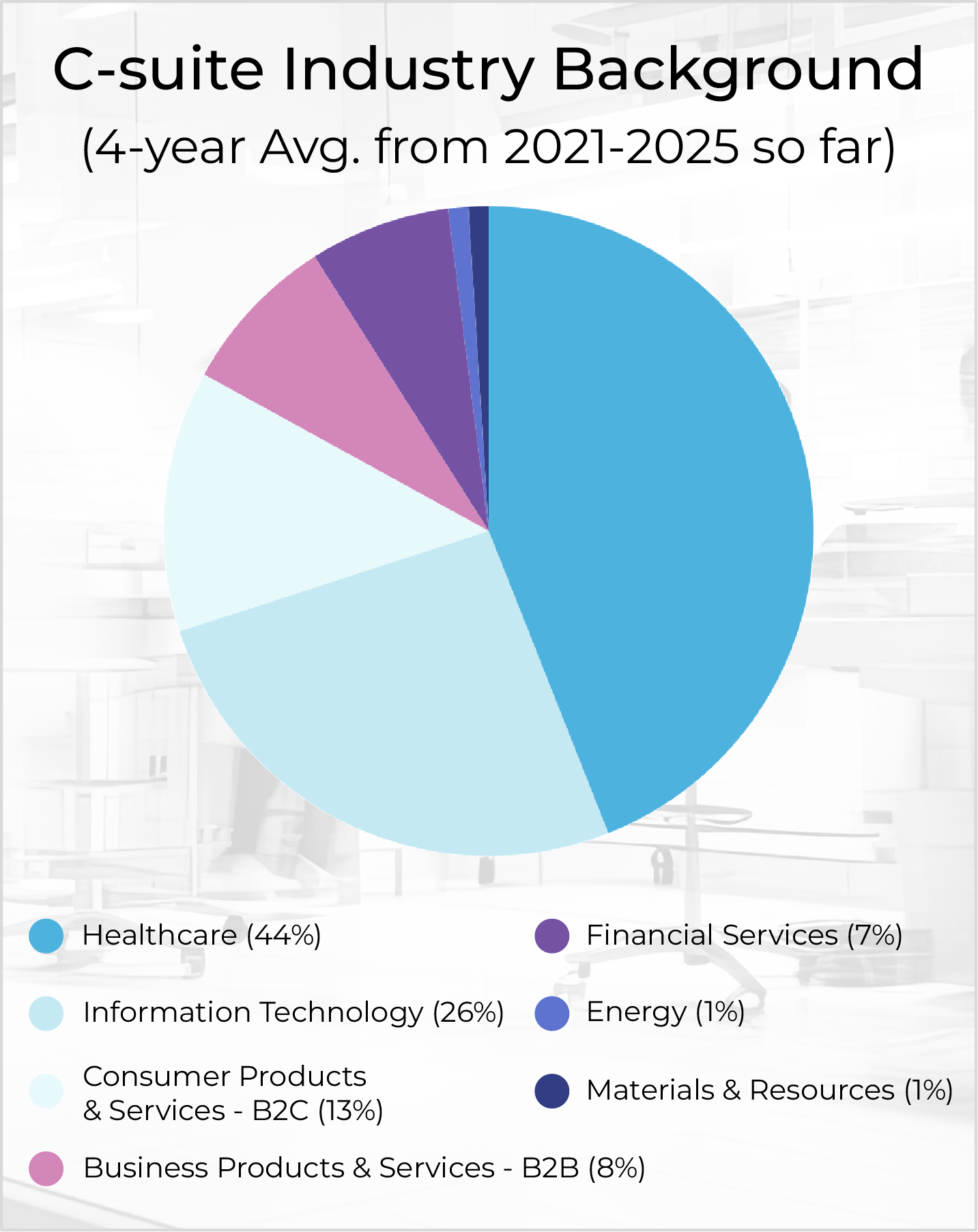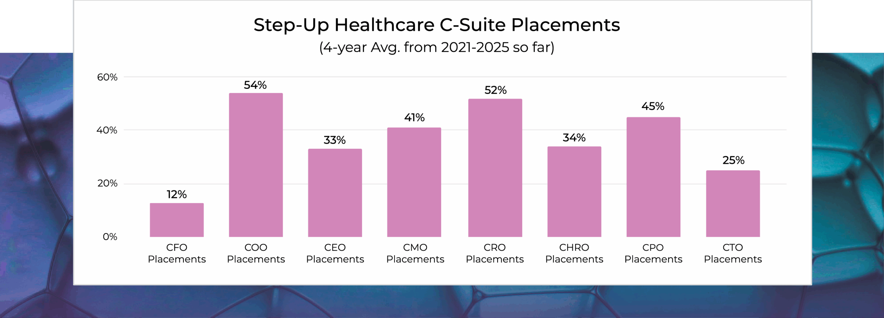 Skills once limited to IT or product development are now essential for top healthcare executives, including the CEO. Our clients demand leaders with a basic grasp of product development, technology integration, and digital transformation. Among healthcare executives we’ve placed in the last four years, CEOs were most likely to have a product background (32%), followed by CMOs (26%). Today’s leadership candidates also need to demonstrate how they have used technology to drive efficiencies, and rebuilt processes from the ground up.