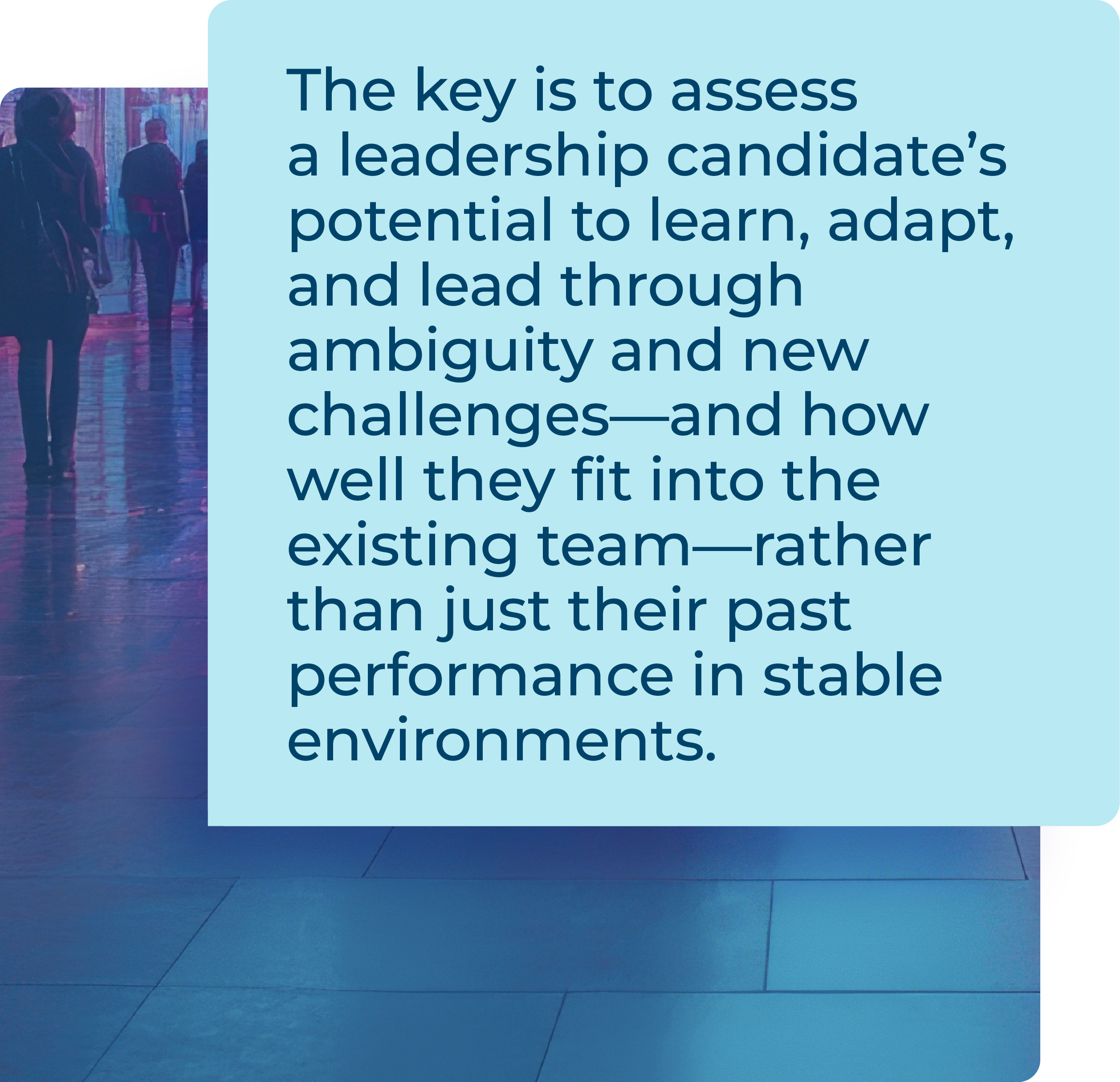 The key is to assess a leadership candidate’s potential to learn, adapt, and lead through ambiguity and new challenges—and how well they fit into the existing team—rather than just their past performance in stable environments.