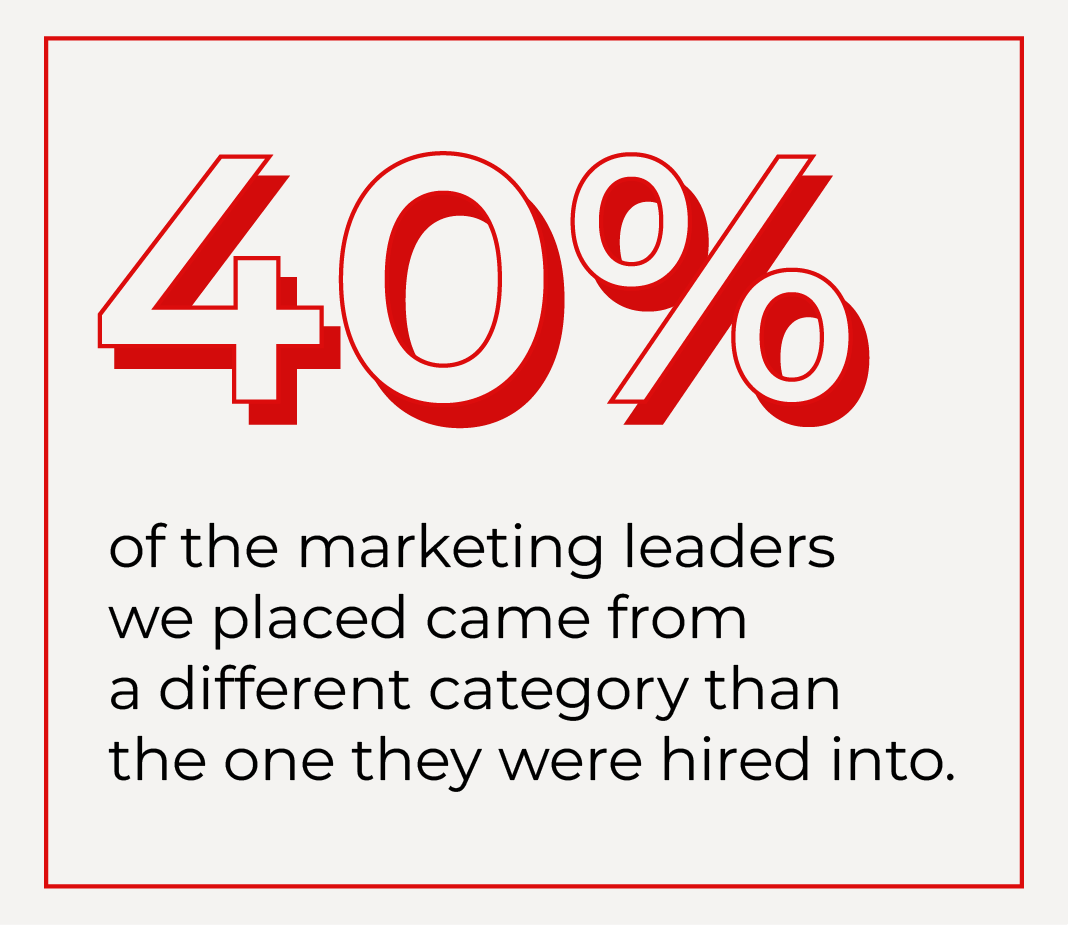 We are seeing a significant shift in talent sourcing strategies. Strikingly, roughly 40% of the marketing leaders we placed came from a different category than the one they were hired into. This indicates that companies prioritise transferable marketing leadership skills over pure domain expertise.
