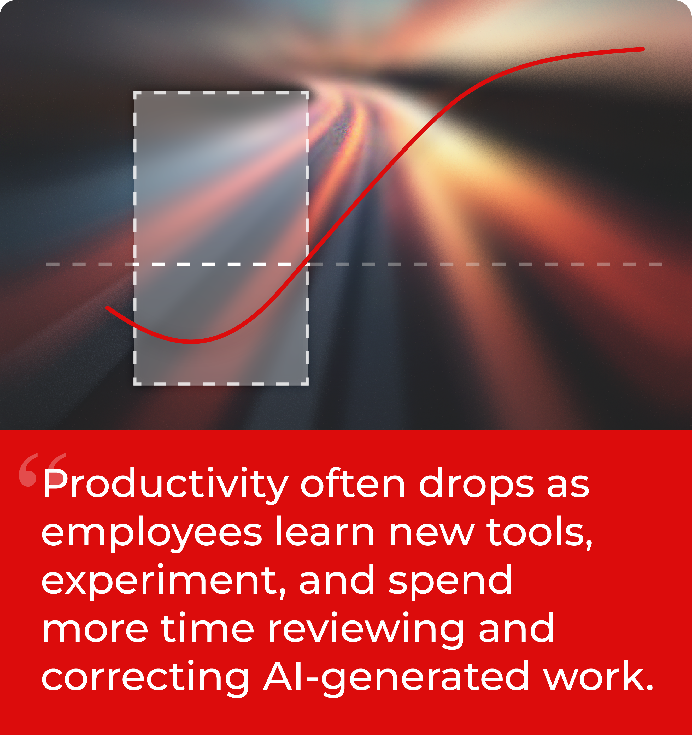Many organizations misread what happens in the first phase of adoption. Productivity often drops and output quality becomes inconsistent as employees learn new tools, experiment, and spend more time reviewing and correcting AI-generated work. Leaders may conclude that the technology is not delivering but this is simply the predictable and necessary learning curve.