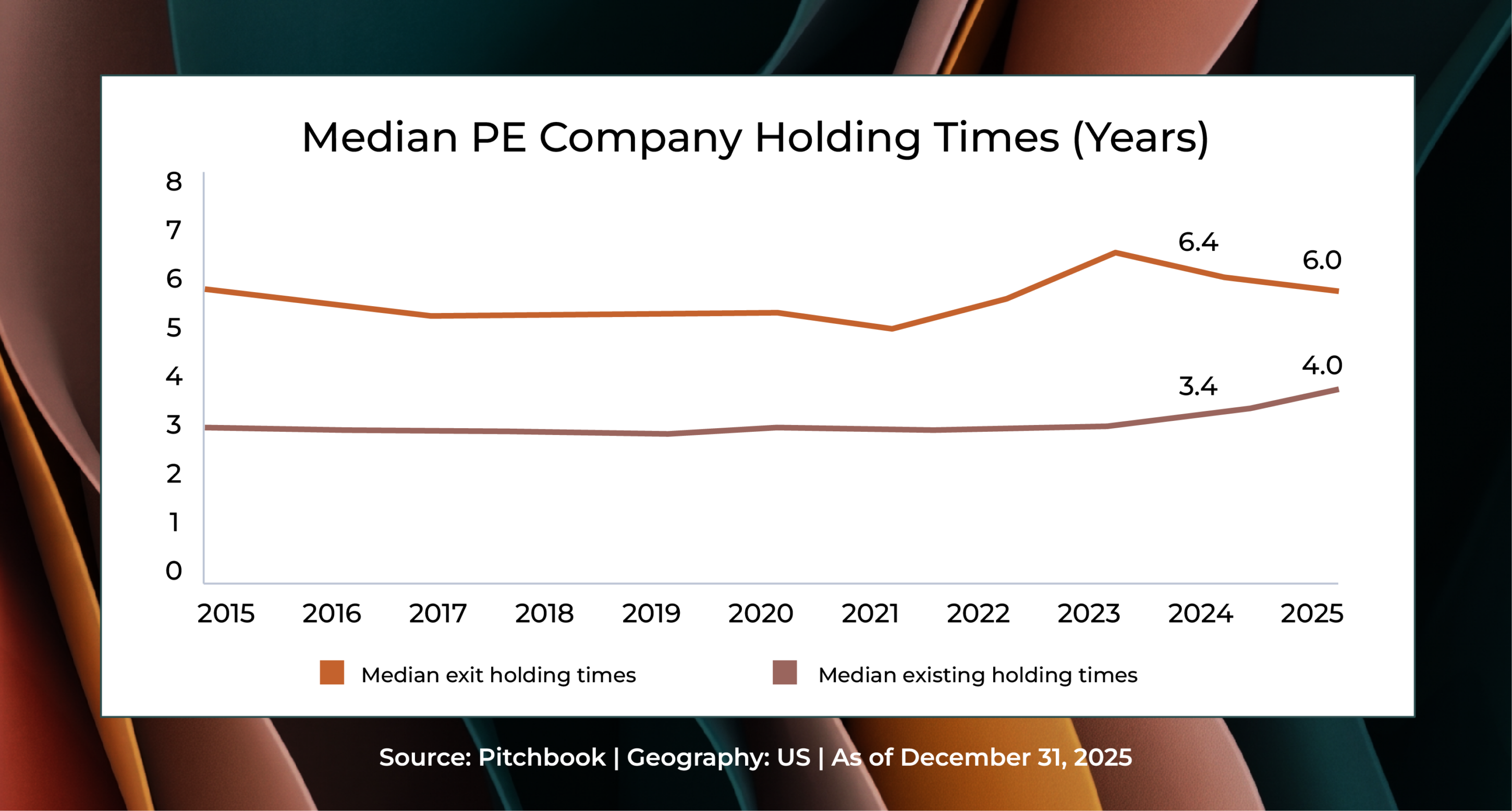 Longer PE holding periods are limiting the executive talent pipeline, as fewer exits reduces the pool of executives with prior PE-backed transformation experience. The traditional step-up path of hiring a CRO, CPO, or COO who has already been through a successful transaction is thinning.