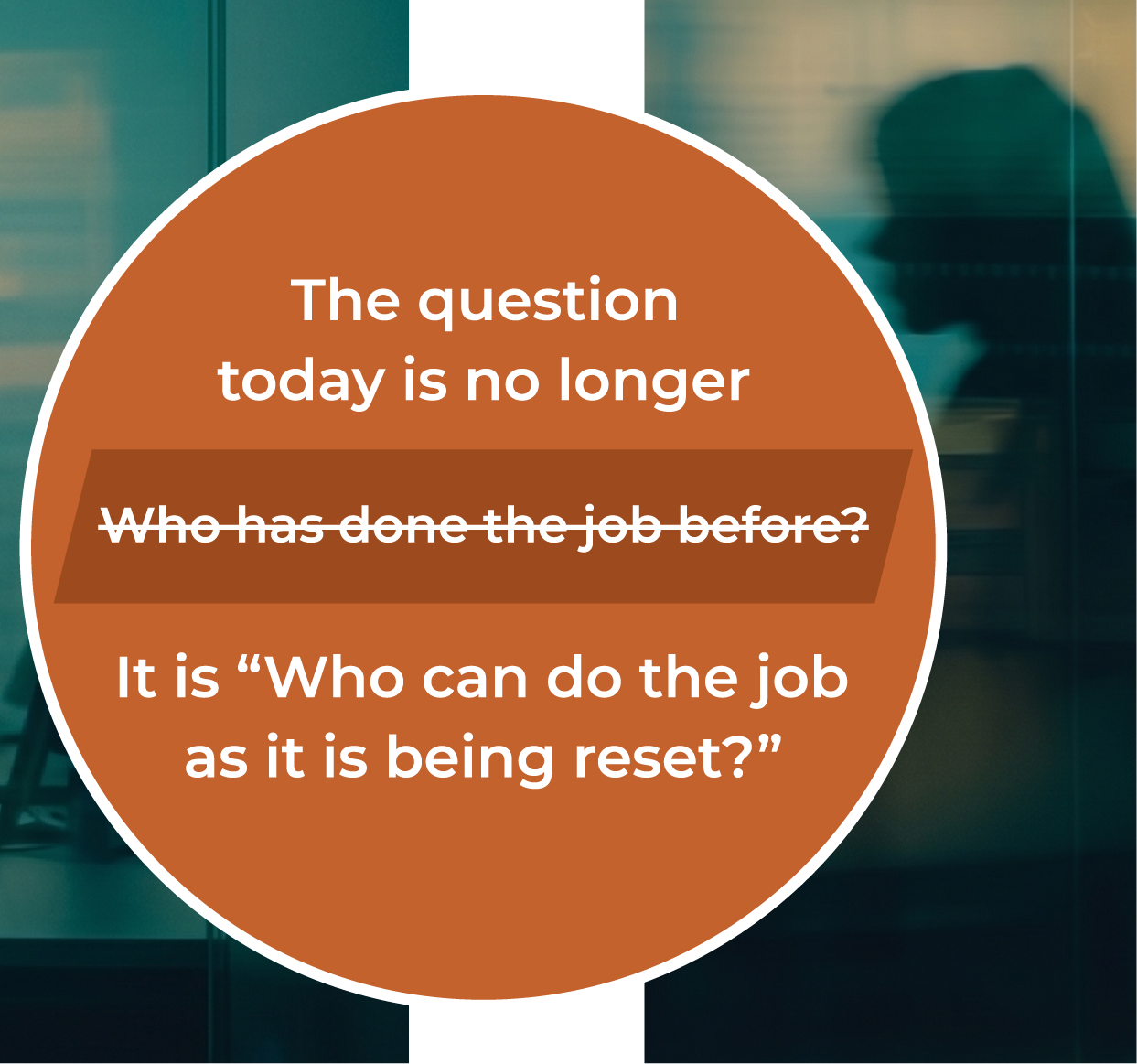 The most significant shift may be how organizations evaluate leadership. While traditional criteria like prior CEO experience, P&L ownership, and industry tenure are still relevant, they reflect a time of stable models and linear career paths.