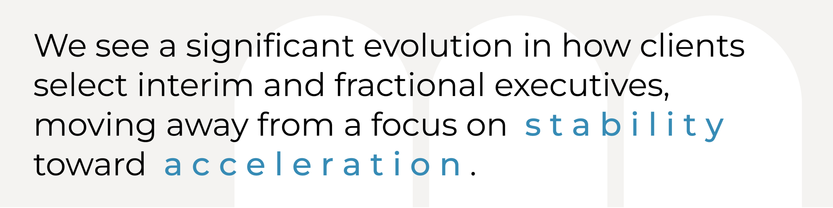 In the traditional talent market, interim leadership often served as a way to maintain stability while searching for a permanent replacement. But the landscape has shifted. Today, companies no longer view these roles as simple gap-fills. Instead, we see a significant evolution in how clients select interim and fractional executives, moving away from a focus on stability toward acceleration.
