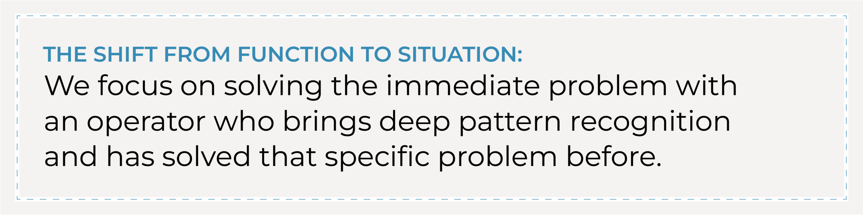 At this stage, the conversation shifts from function to situation. We focus on solving the immediate problem with an operator who brings deep pattern recognition and has solved that specific problem before.